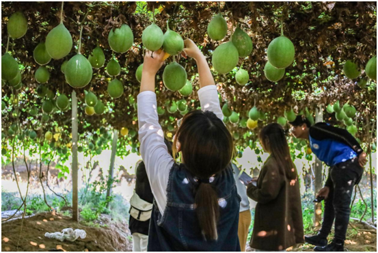 “表皮呈黄色并且开始变软的瓜蒌才符合采摘的条件。”高松村村委会副主任涂敏向大家介绍瓜蒌成熟的标志,同时亲身示范了采摘瓜蒌的具体方法。据涂敏介绍,瓜蒌具有清肺止咳、宽胸散结的功效,是当地百姓增收致富的“金果子”。他表示,学生们的到来,给瓜田里带来了年轻活力,帮助瓜农们推进了采收瓜蒌的“任务额度”。