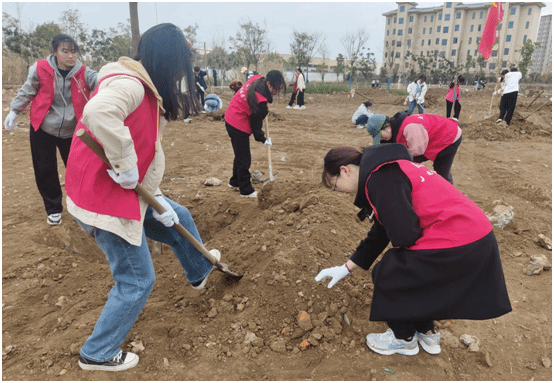这支植树队伍被分成5—8人不等的小组,小组成员之间各司其职、齐心协力,形成一条高效的栽树“流水线”。社区书记和相关工作人员也在一旁为学生们进行分工、指导。