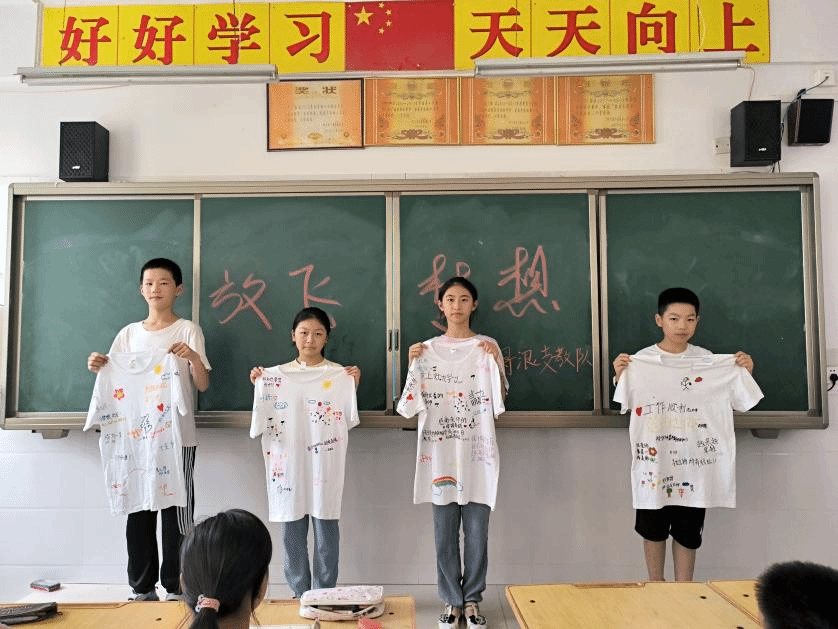 绘七彩世界,寄托美好期望。美术课上,学生们专心于画笔的每一次挥动,传承红色基因,共绘红色故事,充分发挥想象力,为队员们绘制文化衫。