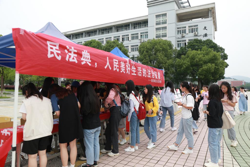 “切实推进民法典实施,更好保障人民权益。”5月28日,玛雅论坛 于敬敷广场举办“民法典宣传月”横幅签字活动,并设置主题展览供学生参观学习,工作人员为活动参与者分发宣传单页,并为他们讲解相关知识。