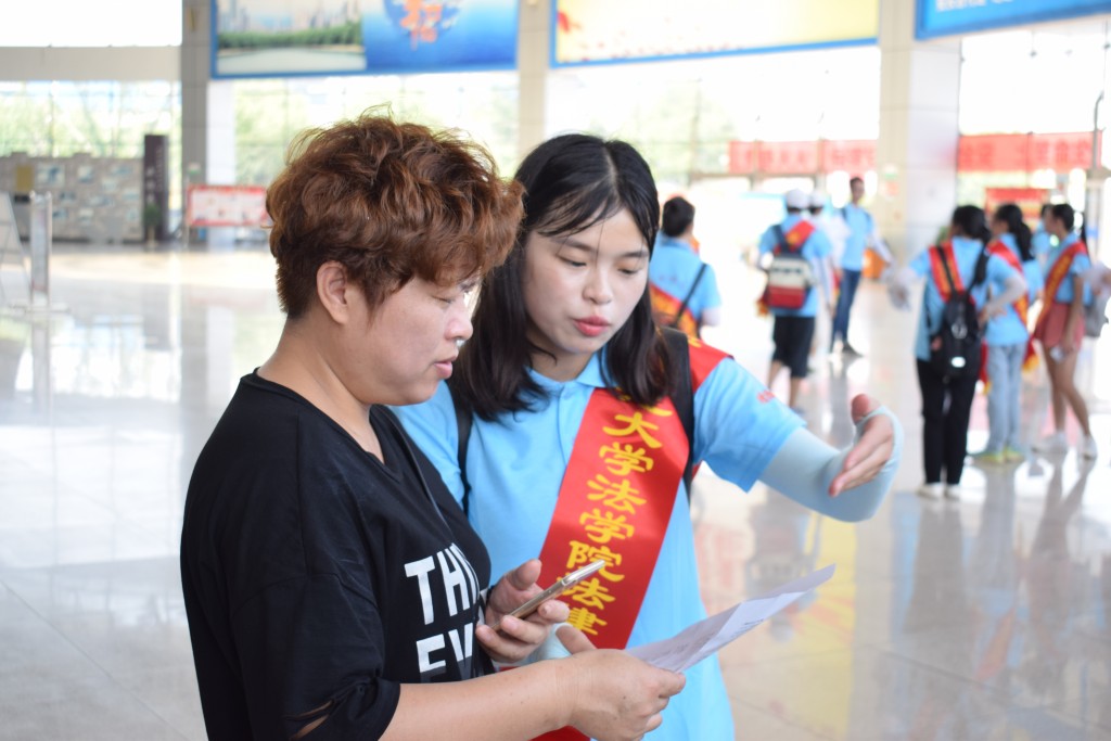 本次宣传的主要面向人群是外来务工人员,所以,成员们走进售票处、候车大厅、车站处等农民工较为密集的区域,给他们发放普法资料和法律读本,并给予热情细致的讲解,提高他们的自我保护能力和防范能力,增强法治观念和法律维权意识。对于在讨薪、工伤待遇方面有疑虑的农民工,成员们尽己所能给他解答,并积极提出有效建议。此外,志愿队还搭建了爱心服务平台,不仅给乘客们提供法律咨询,还有指引等服务。