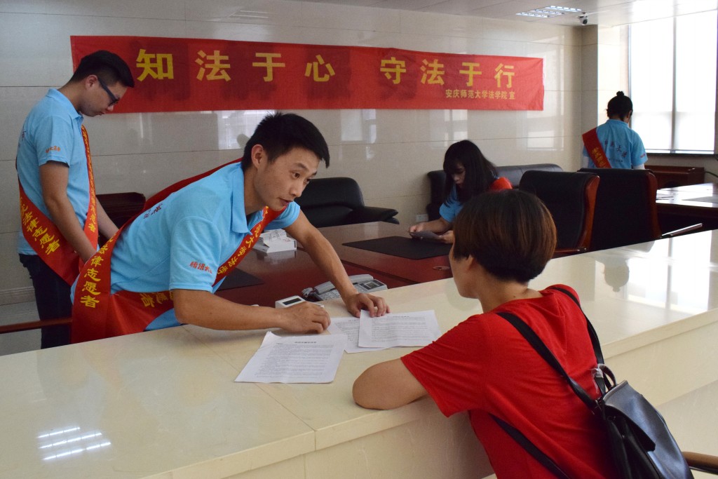 成员们走进法院大厅,在法律援助窗口挂起“知法于心,守法于行”的横幅,搭建服务台,等待来访群众的咨询。下午温度高,法院的来访者不多,但服务台前还是不缺咨询的人。来访者对成员们提出了不少自己在法律方面的疑虑,成员们依照相关条例逐一进行了细致的解答。同时,成员们给等待的来访群众分发了宣传材料,并针对群众关心的部分进行热情的讲解。这一次,成员们带来了多份条例材料,内容都是与来访群众贴身利益相关的法律条例,如《信访案件的处理程序和方法》《治安管理处罚法》《消费者权益保护法》等。这些成员们精心准备的宣传材料通过问答、小标题等形式将生涩的法律条文变得通俗易懂,使来访群众对法律法规有了更加深入的理解和体会。