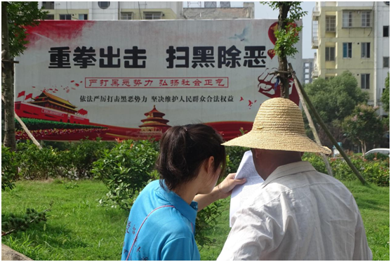 (图为团队志愿者在大桥街道给民众宣传“扫黑除恶”及“依法治国”相关内容)