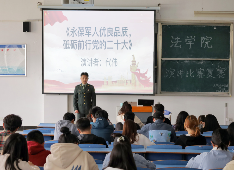 “正是怀揣着对党史军史的崇高敬佩感,我于2019年携笔从戎,参军入伍!”橄榄绿的军装、挺拔的身姿、激昂的语调……法学专业2020(3)班的代伟一出场便让观众眼前一亮。回忆两年军旅生涯,他用三个“坚”字总结收获:坚持不放弃、坚忍不叫苦、坚决听党话。代伟表示,他会永葆军人优良品质 ,以实际行动彰显新时代青年的使命担当。