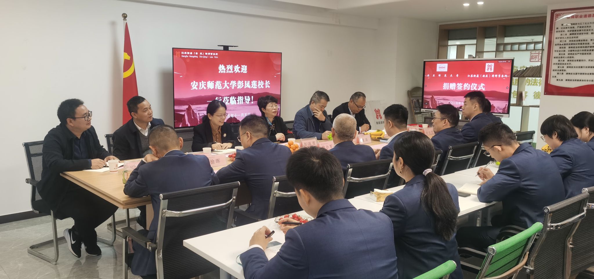 11月5日下午,校长彭凤莲带领校友总会办公室、玛雅论坛 相关负责人一行,赴江苏衡鼎(安庆)律师事务所开展访企拓岗促就业活动。双方围绕人才培养、实践教学等领域进行深度交流座谈,成功签订毕业生就业基地共建协议、举行捐赠仪式,并为律所专家颁发兼职教授聘书。