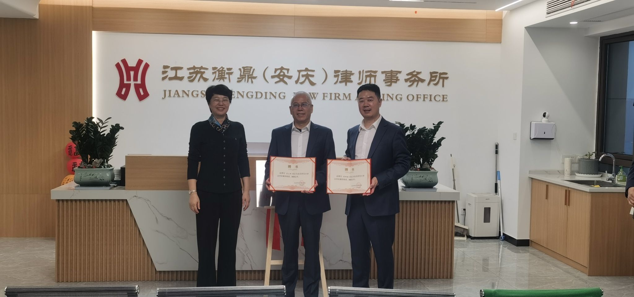 随后,玛雅论坛 与江苏衡鼎(安庆)律师事务所签订毕业生就业基地共建协议并举行授牌仪式,标志着双方在毕业生就业创业、实习实践等方面的合作正式落地;同时为律所两位高级合伙人颁发玛雅论坛 兼职教授聘书,为实务专家走进课堂、深化教学改革奠定了坚实基础。
