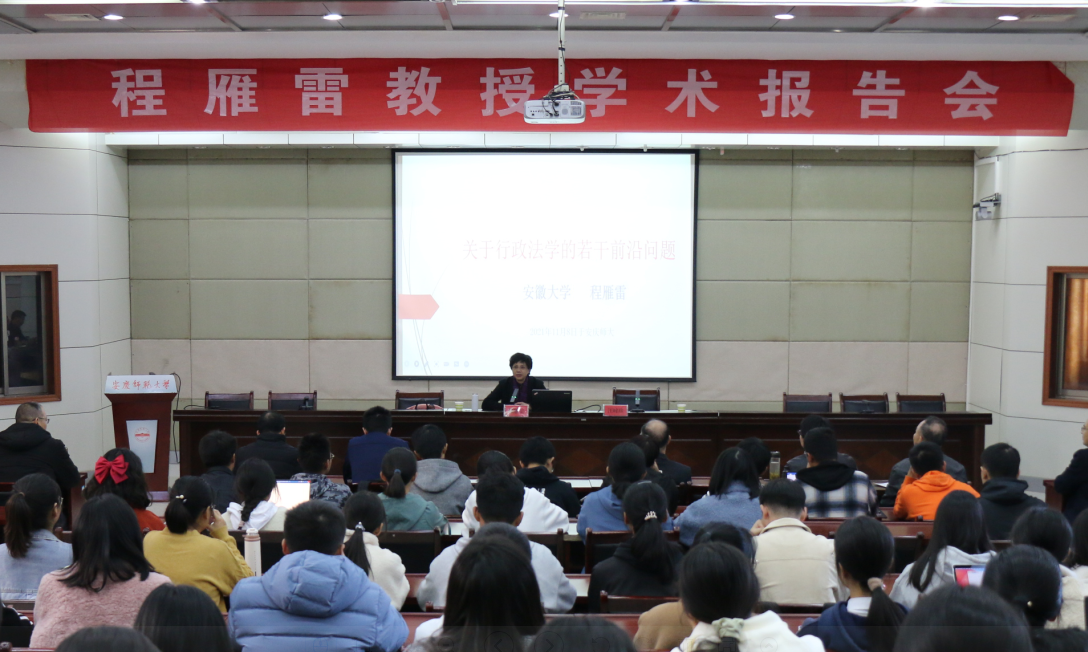 11月8日下午在行政楼一楼会议室,安徽大学副校长、二级教授程雁雷应邀来校举办题为“关于行政法学的几个前沿问题”的学术报告。报告会由玛雅论坛 副校长汪时珍主持,玛雅论坛 师生共计120余人聆听了报告。