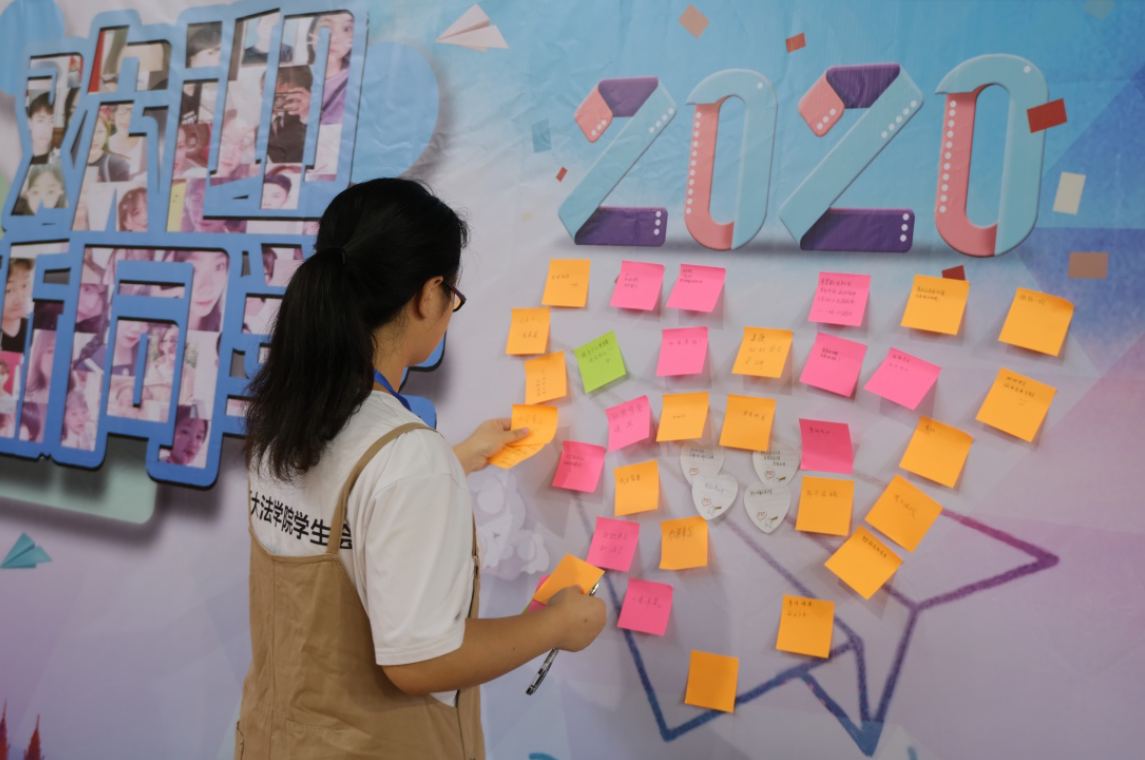 “向奖学金进发”、“四年时光,不虚此行”、“加油考研”,玛雅论坛 新生报到处展板上贴满了新生写的开学愿望贴,每一张都表达了新生踏入大学生活的寄托和心愿。展板上由280名新生照片汇成“欢迎新同学”五个大字,也让2020级新同学倍感亲切。