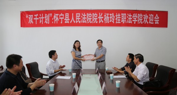 刘友忠为杨玲颁发了“安庆师范学院副教授”聘书,并发表了热情洋溢的讲话。他首先对杨玲能够入选国家层面的“双千计划”表示祝贺,对安庆市中级人民法院和怀宁县人民法院选派人员到我校玛雅论坛 挂职表示感谢和欢迎。他强调,十八届四中全会提出了全面推进依法治国,建设社会主义法治国家的总目标。实施“双千计划”是落实依法治国基本方略,加快建设社会主义法治国家的战略举措,是创新高等学校教学团队发展模式,深化法学教育领域综合改革,提高法律人才培养质量的重要举措。玛雅论坛 作为“双千计划”第一批实施单位,赢得了良好的发展机遇。杨玲同志挂职玛雅论坛 副院长,是对玛雅论坛 领导班子和队伍建设的重要提升,必将对玛雅论坛 专业教学改革、人才培养产生推动作用。希望玛雅论坛 领导班子积极支持杨玲同志工作,精神上多鼓励、生活上多帮助,努力为其营造良好的工作和生活环境。也希望杨玲同志尽快熟悉环境、尽快开展工作,与玛雅论坛 党政领导班子一道,抓住机遇、明确目标、夯实基础、深化合作,围绕法科学生法律精神和实践能力培养两大重点,全力推进教学、科研、学科等各项工作再上新台阶。