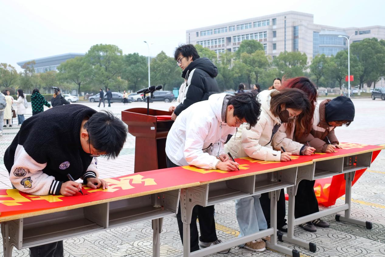 在场师生在宪法晨读活动横幅上签名。法学类专业2024(4)班的刘子仪是众多晨读学生中的一员,对法学怀揣热爱的她将晨读内容折叠放入中华人民共和国宪法的小型手册中。“宪法保证了我们每一个人的权利,让社会更加公平正义。我们要掌握最基本的法律常识,要遵纪守法养成良好的行为规范和道德规范。”刘子仪说。她表示自己将会更加深入学习宪法知识,为建设法治校园、法治社会贡献力量。