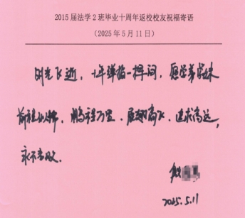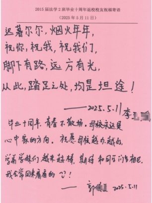 与会校友纷纷发言,回忆了在校学习的点滴时光,畅谈毕业十年间的工作经历与人生感悟。一位校友表示,“这是毕业十年第一次回家,母校的教诲让我始终铭记法律人的责任与担当,十分感谢母校的培养为我们奠定了坚实的职业基础。”校友们结合自身在司法机关、律所以及企业法务岗位的工作经验,围绕法学实践教学、校企协同育人、校友资源共享等提出了宝贵的建议和意见,现场气氛热烈融洽。活动还特别设置了“手写祝福寄语”环节,校友们在明信片上写下对母校的祝愿与对学弟学妹的期许,字字真挚,句句情深。