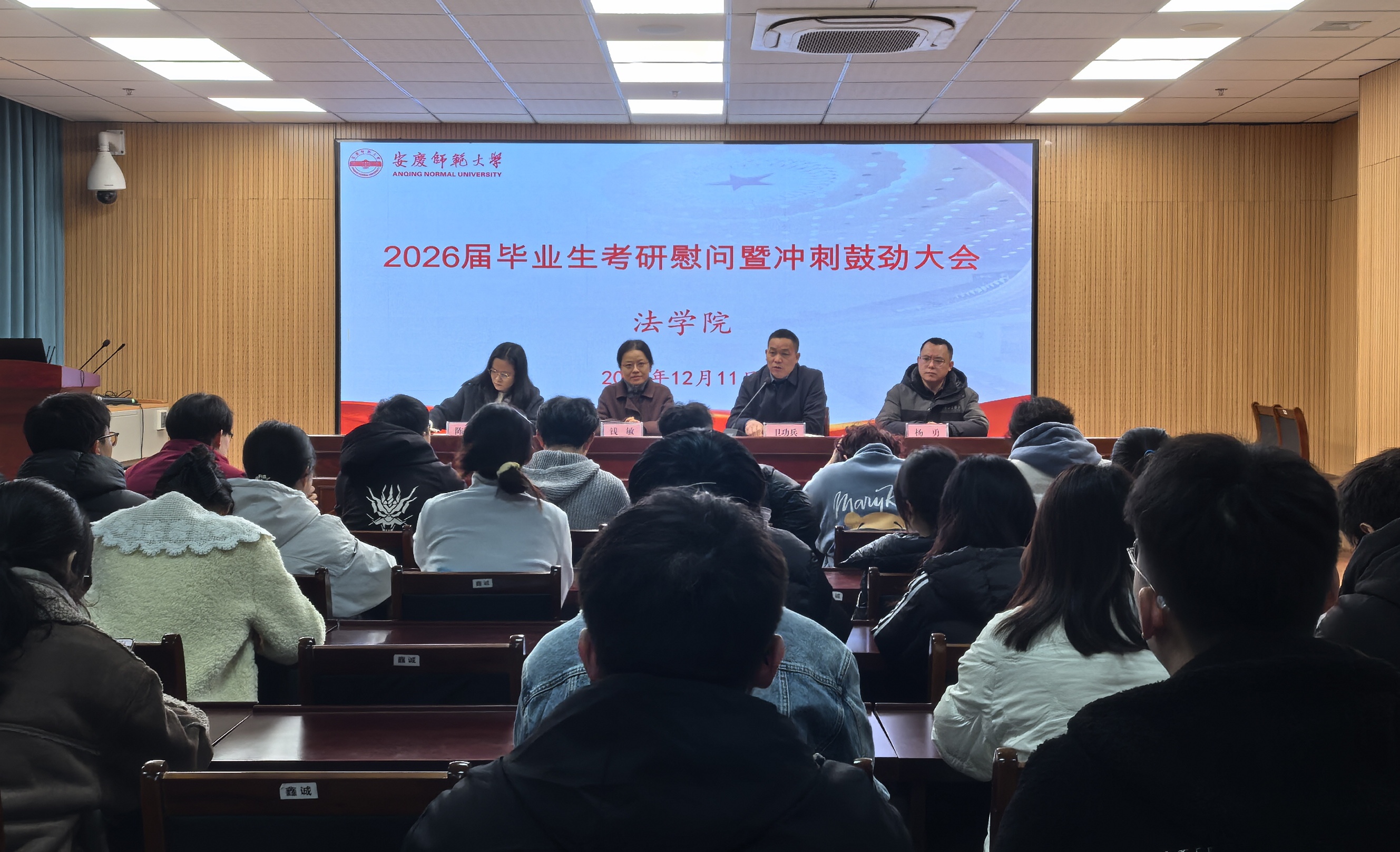 12月11日,玛雅论坛 在102法治大讲堂举办2026届毕业生考研慰问暨冲刺鼓劲大会。玛雅论坛 党委书记钱敏出席会议并讲话,2026届毕业班辅导员、考研学生参加会议,党委副书记卫功兵主持。