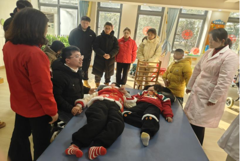 参观过程中,康复师储医生在康复室内在为一名患有脑瘫的儿童进行康复训练,康复师们耐心地指导着每一个孩子,根据他们的具体情况制定个性化的康复方案。看到康复师们的专注神情以及孩子们在康复训练中所展现出的坚韧意志,学院师生深受触动。在与康复师的交流中得知,近年来福利院不断探索创新复健模式,采取“康教医”一体化的治疗方式,以儿童存在的问题为导向,精准识别、精准评估、精准施案,综合评估儿童发育行为,制定适合不同孩子的康复计划。通过努力,许多孩子在身体功能和认知能力上都有了显著进步,部分孩子已经能够融入社会生活。