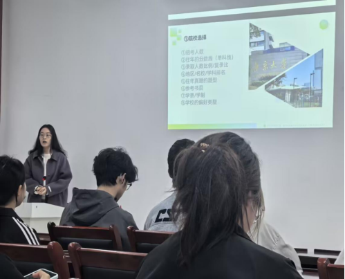 刘泽红从考研的前期准备、公共课与专业课学习应考策略等方面进行系统讲解。她鼓励同学们在备考过程中保持良好心态、避免过度焦虑,要坚守初心,以“钝感力”应对压力与挑战,勉励同学们坚持到底、自信前行。