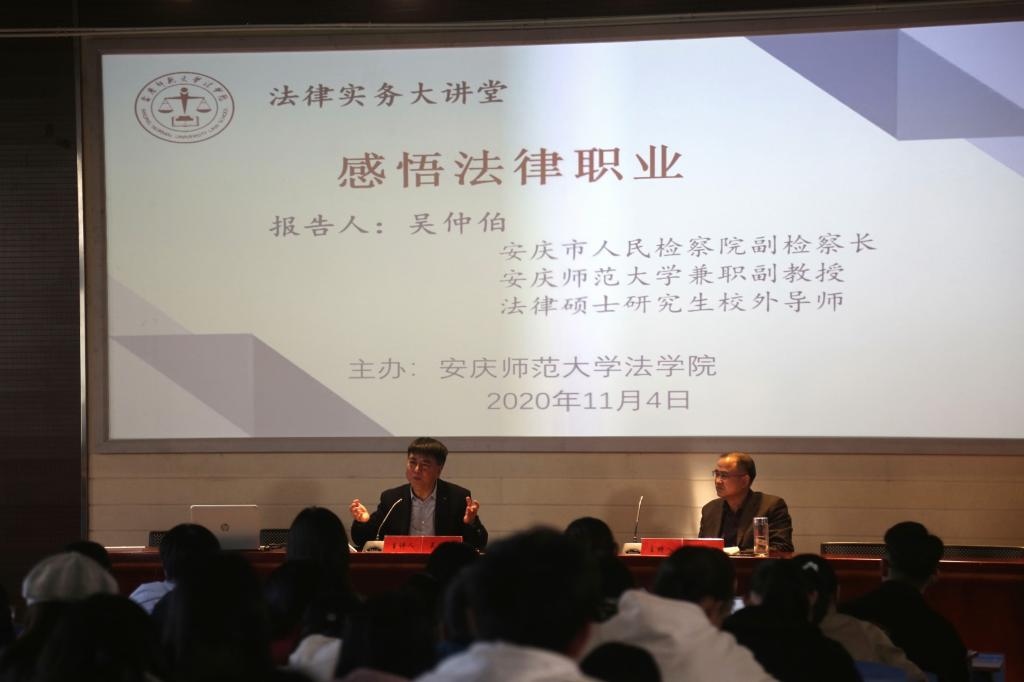 吴仲伯副检察长1983年毕业于安徽大学法律专业,曾先后在安庆市迎江区人民法院、安庆市中级人民法院、安庆市人民检察院长期从事审判、检察工作和法院、检察院的领导工作,具有丰富的审判、检察工作经验。他的报告以丰富的法律职业经验和丰厚的法学理论为基础,通过丰富的鲜活实例,朴实无华的语言,深刻地阐述了自己对法律职业的感悟,给同学们塑造成为法律职业人提供了宝贵的经验的重要指导,受到了师生的热烈欢迎。(撰稿:汪语晴、张楠 图片:吴斌 审核:焦少林)