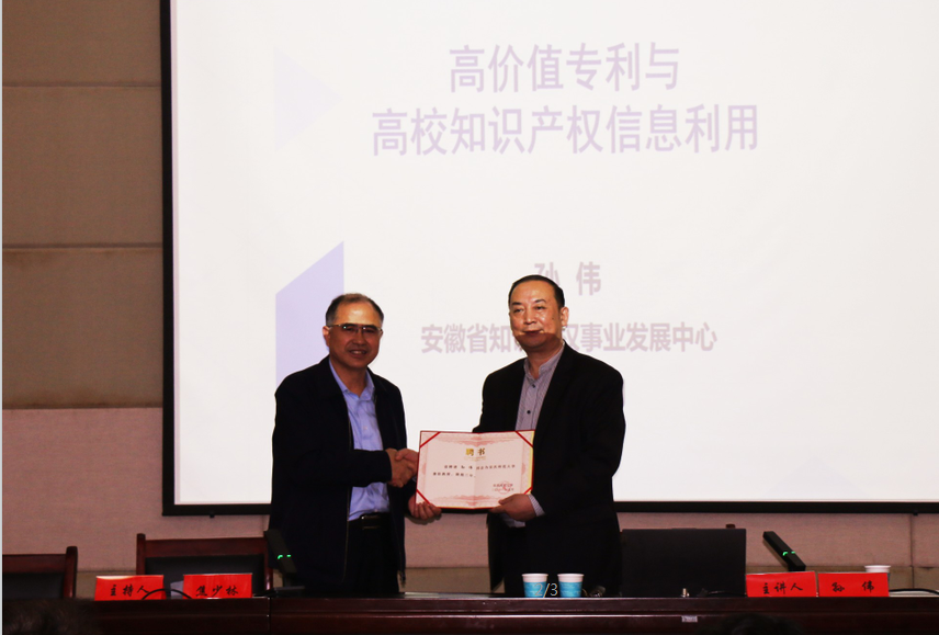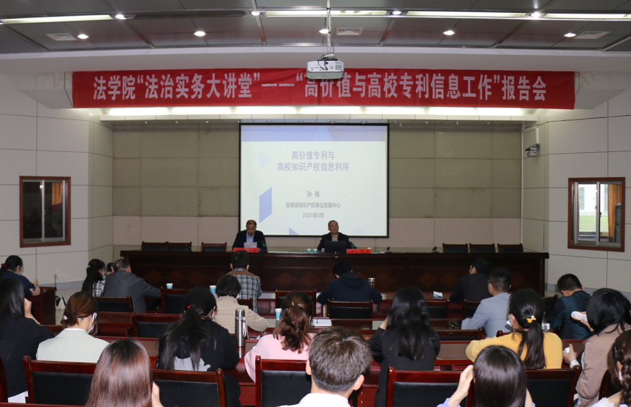 5月19日下午,安徽省知识产权事业发展中心二级调研员孙伟受邀法治实务大讲堂作了题为“高价值专利与高校知识产权信息利用”的学术报告。本次报告会是在校五月活动月之际,由校科研处、玛雅论坛 共同举办的。玛雅论坛 师生及安庆市知识产权局部分领导近200人参加了报告会。