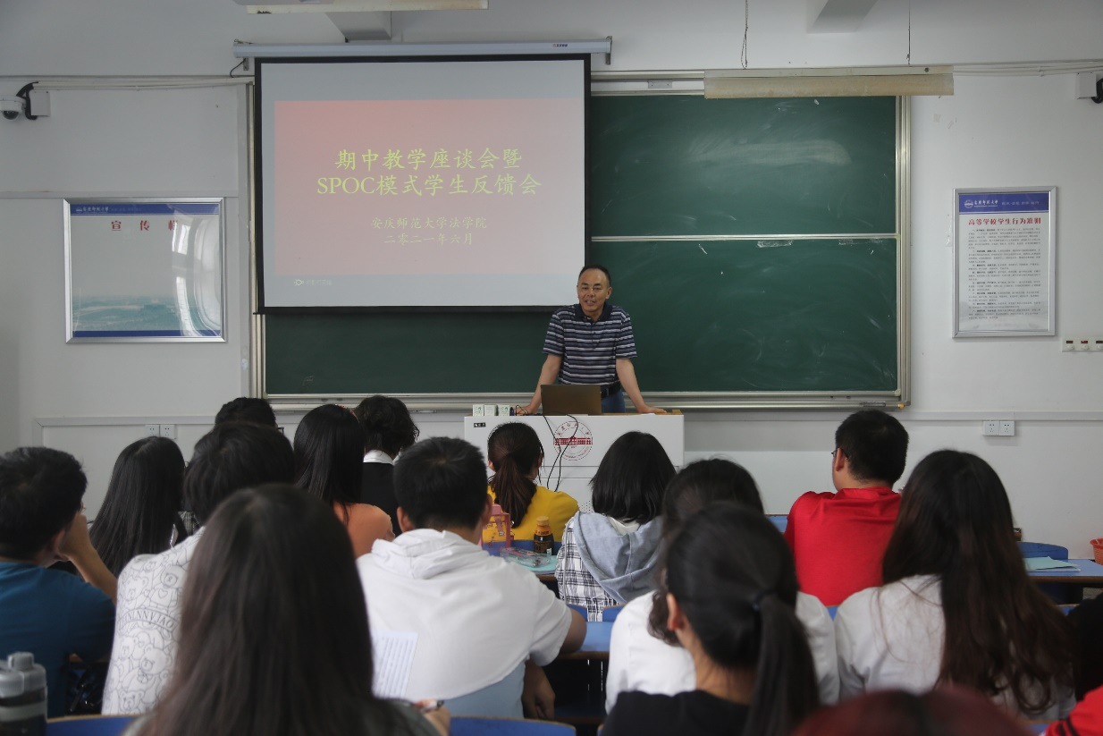 邱少晖老师首先就SPOC模式的探索历程做了简要回顾。课程自2018年实施省级质量工程项目“中国法制史 MOOC”以来,拍摄有20个专题视频,形成了PPT、教案、参考资料、习题、测验、课堂讨论、作业、考试以及35000余字的讲义等非视频材料,并通过安徽e会学平台线上运行。自2019年秋季开学后就开始结合线上资源开展线下课堂教学,效果良好,疫情期间有效支持了课程教学,确保了停课不停学。结合国家一流课程申报,对于如何进一步推进以学生为中心的教学模式改革、探索创新翻转课堂成为新的课题。邱少晖老师认为学院专门召开此次座谈会,请全程参与课程学习的学生代表提出建议和意见,既是对以往经验的总结,也是为新课题的开展指明了方向,对于进一步推进课程模式改革具有重要意义。