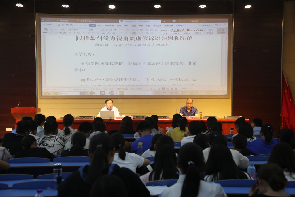 9月25日,安徽长江人律师事务所祖同银律师应邀莅临法律实务大讲堂,以“以借款纠纷为视角谈虚假诉讼识别和防范”为题作专题讲座。玛雅论坛 部分教师、全体2019级法律硕士研究生和2018级部分本科生共160余人聆听了报告。院长焦少林教授主持了讲座。
