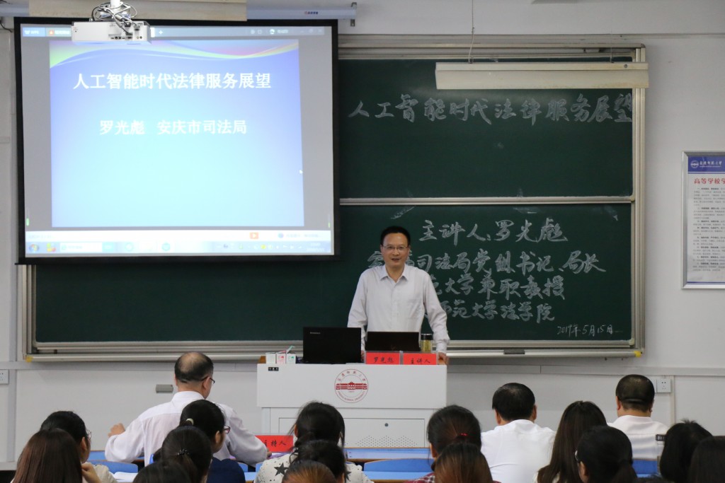 5月15日下午,安庆市司法局党组书记、局长,我校兼职教授罗光彪在龙山校区文津楼D405教室开展“人工智能时代法律服务展望”为主题的讲座。此次活动由院长焦少林主持,院党总支书记詹德全和部分教师、学生共120余人聆听了报告。
