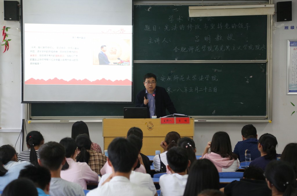 5月23日下午,合肥师范学院马克思主义学院院长吕明教授应邀来校作了一场题为“宪法修改与坚持党的领导”的学术报告。玛雅论坛 学生党员、入党积极分子和法学专业2017级部分学生聆听了报告。报告由院长焦少林教授主持,公法教研室主任王欣副教授进行点评。