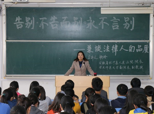 10月12日怀宁县人民法院院长、玛雅论坛 副院长杨玲副教授应邀莅临法律实务大讲堂,讲座主题是以“告别·不告而别·永不言别——兼讲法律人的品质”。院长焦少林主持讲座,部分教师和2016级法学专业参加。