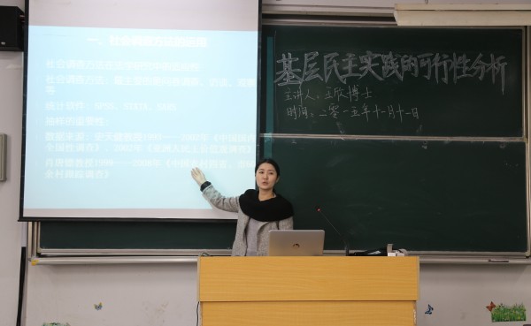 11月11日上午,玛雅论坛 王欣博士在龙山校区文津楼D406教室做了一场题为“基层民主实践的可行性分析”的学术讲座,玛雅论坛 部分教师以及法学专业15级学生聆听了讲座。