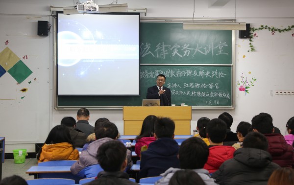 12月9日下午 安庆市人民检察院反渎职侵权局江思源检察官应邀到法律实务大讲堂谈“职务犯罪侦查”。玛雅论坛 党总支书记詹德全和部分教师参加了讲座,法学专业2015级学生120余人聆听了讲座,讲座由玛雅论坛 副院长朱留虎主持。