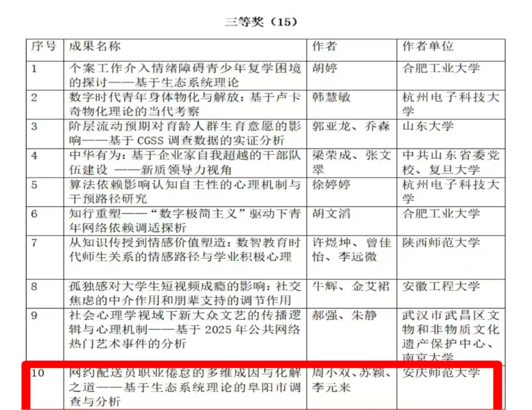 近日,安徽省社会心理学学会发布了《关于表彰2025年学术年会优秀成果的决定》。本次学术年会共收到来自中国科技大学、武汉大学、南开大学、安徽大学等省内外高校和科研机构的学术论文148篇。经专家匿名评审,共评选出优秀成果46篇,其中,一等奖7篇、二等奖14篇、三等奖15篇、优秀奖10篇。